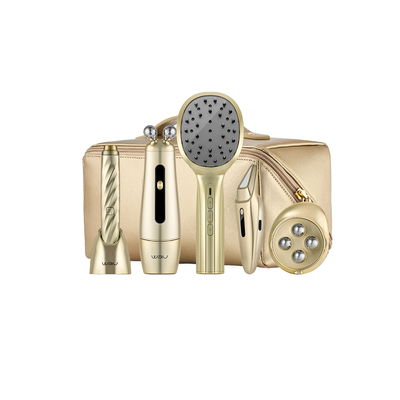 Découvrez la collection ultime pour une beauté et un bien-être holistiques — The Golden Box. Cet ensemble complet et soigné réunit cinq appareils de pointe, de qualité professionnelle, conçus pour cibler chaque aspect de votre routine de soins personnels : du rajeunissement du visage et du remodelage du corps à la santé du cuir chevelu. C'est un système de transformation personnelle complet qui combine des technologies de pointe pour des résultats visibles de la tête aux pieds.