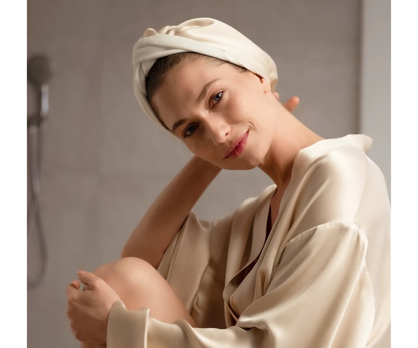 सेट: नींद के लिए मास्क, तौलिया-टर्बन और आकर्षक कट का रॉब-किमोनो — एक ही संगीत के तीन नोट्स: रुकें, रेशम की नरमी में लिपट जाएं और खुद को शानदार महसूस करने दें। आराम, अधिकार और रोमांटिक माहौल बनाने के लिए एक उत्कृष्ट उपहार